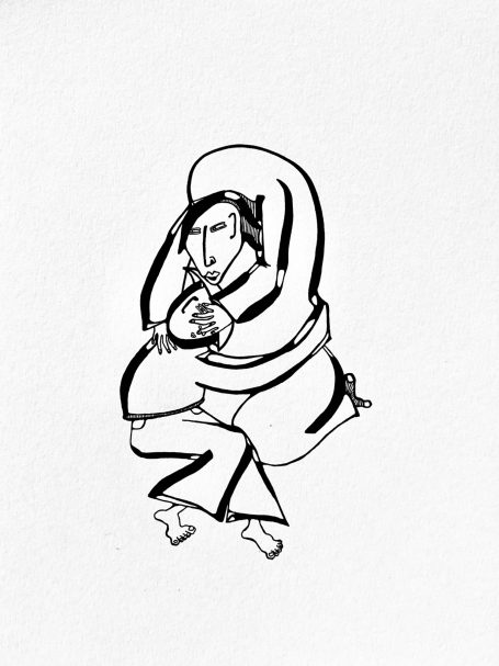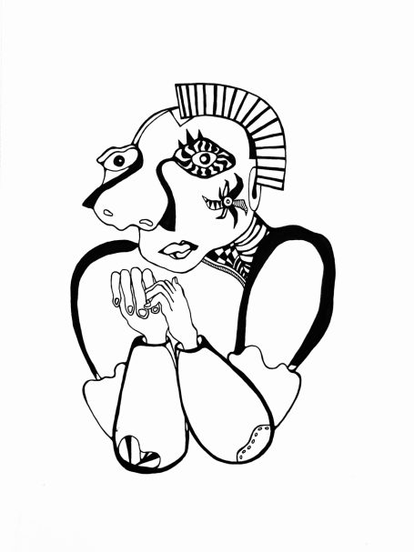 My illustrations consist of hand-rendered line work with black ink on paper. Select illustrations undergo subtle interventions through scanning, compositing, and digital manipulation. They are made in similar rhythm to my poetry, emerging initially as intuitive, thick strokes framing the subject(s), then woven together through precise “needlework.” Each line, word, shape, and subject is influenced by various stimuli in the space I am working in, be it the shape of a jazz tune, the gait of passersby, or the bulges of a nearby tree trunk.